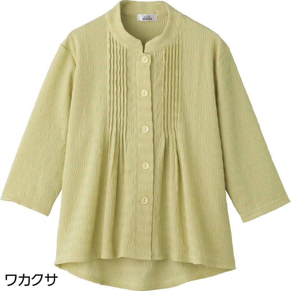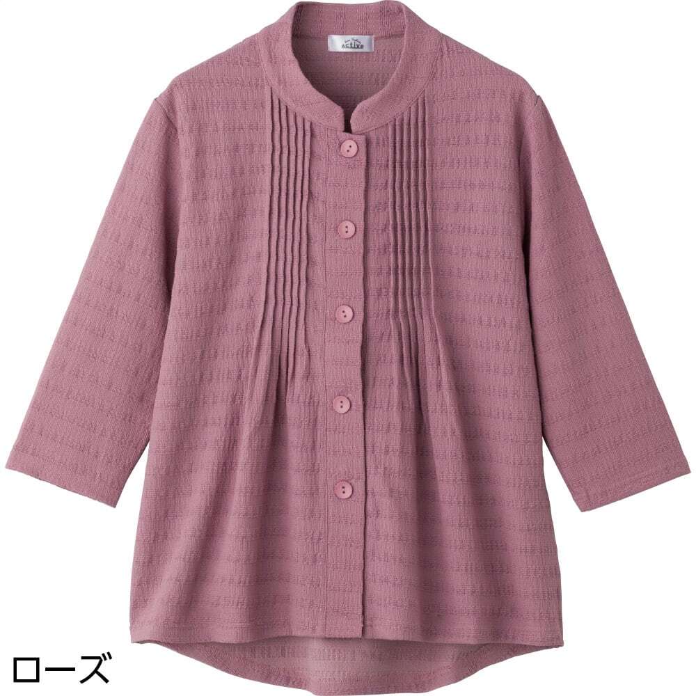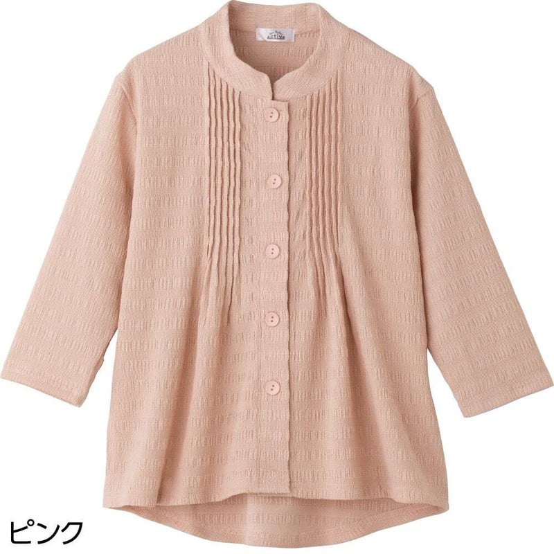 7分袖斜め釦ホールピンタックブラウス