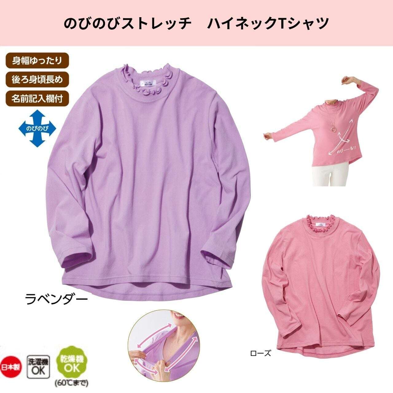 アームホールや袖もしっかり伸びるから、肩や腕が動かしづらい方もラクラク!