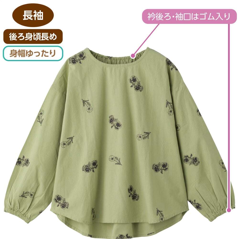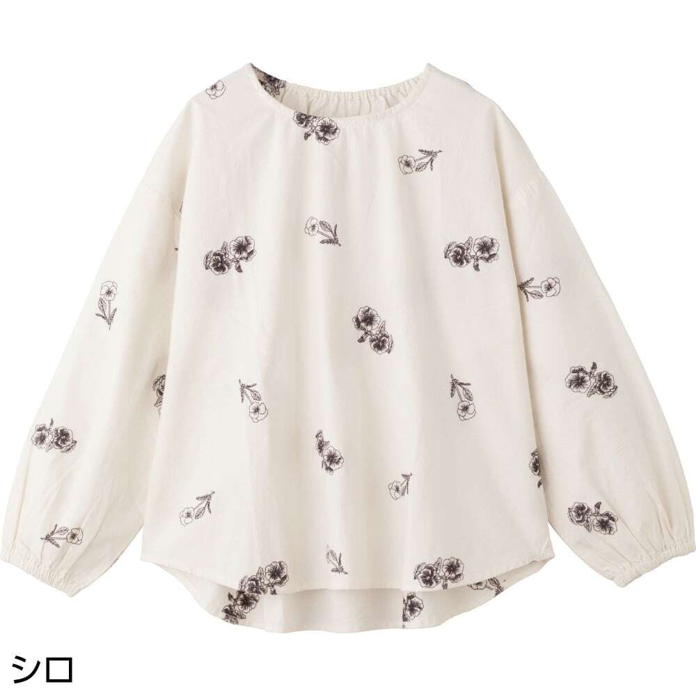 パンジー柄刺繍衿袖ゴムブラウス