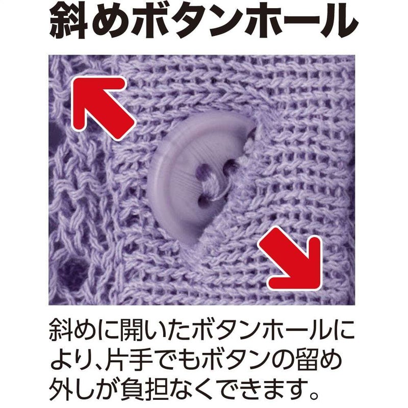 斜めに開いたボタンホールにより、片手でもボタンの留め外しが負担なくできます