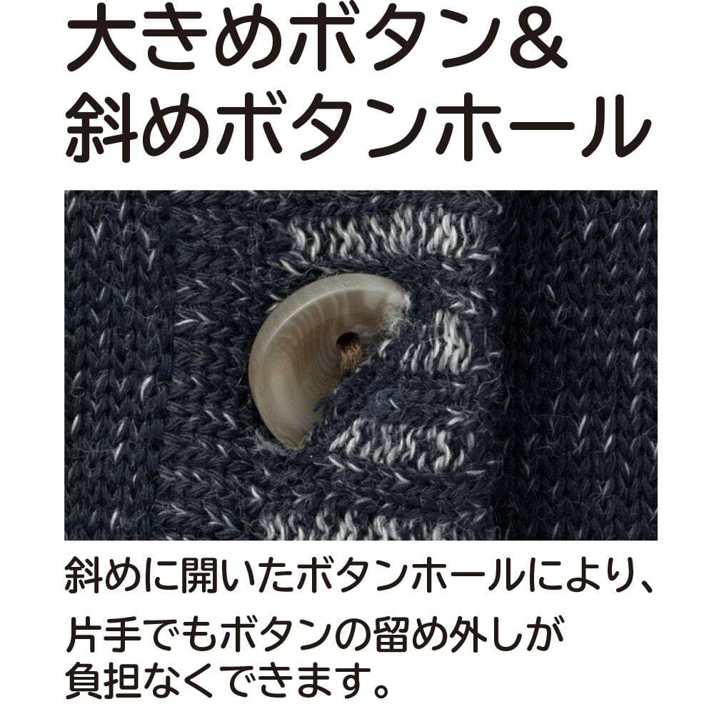斜めに開いたボタンホールにより、片手でもボタンの留め外しが負担なくできます。