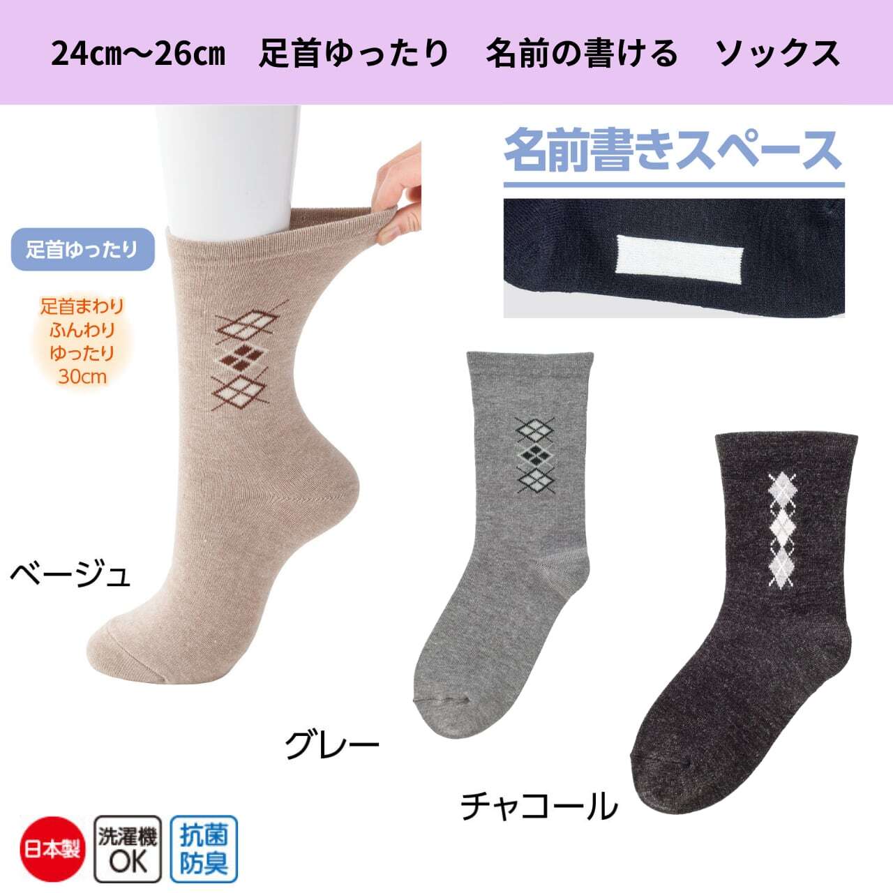 名前が書けて、アーガイル柄が若々しい足首ゆったりソックス。