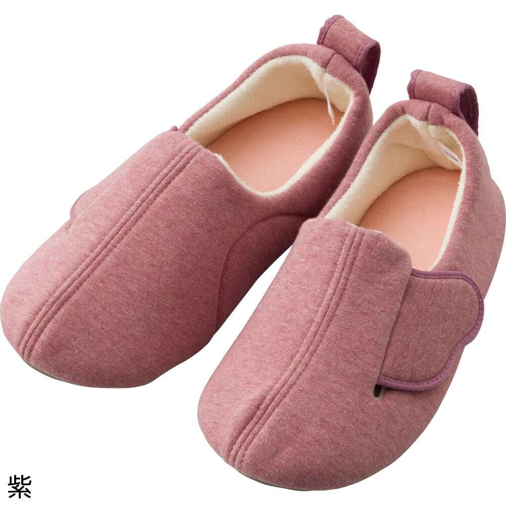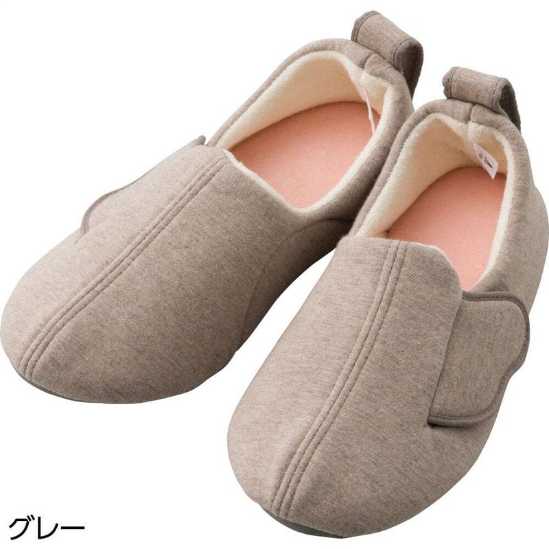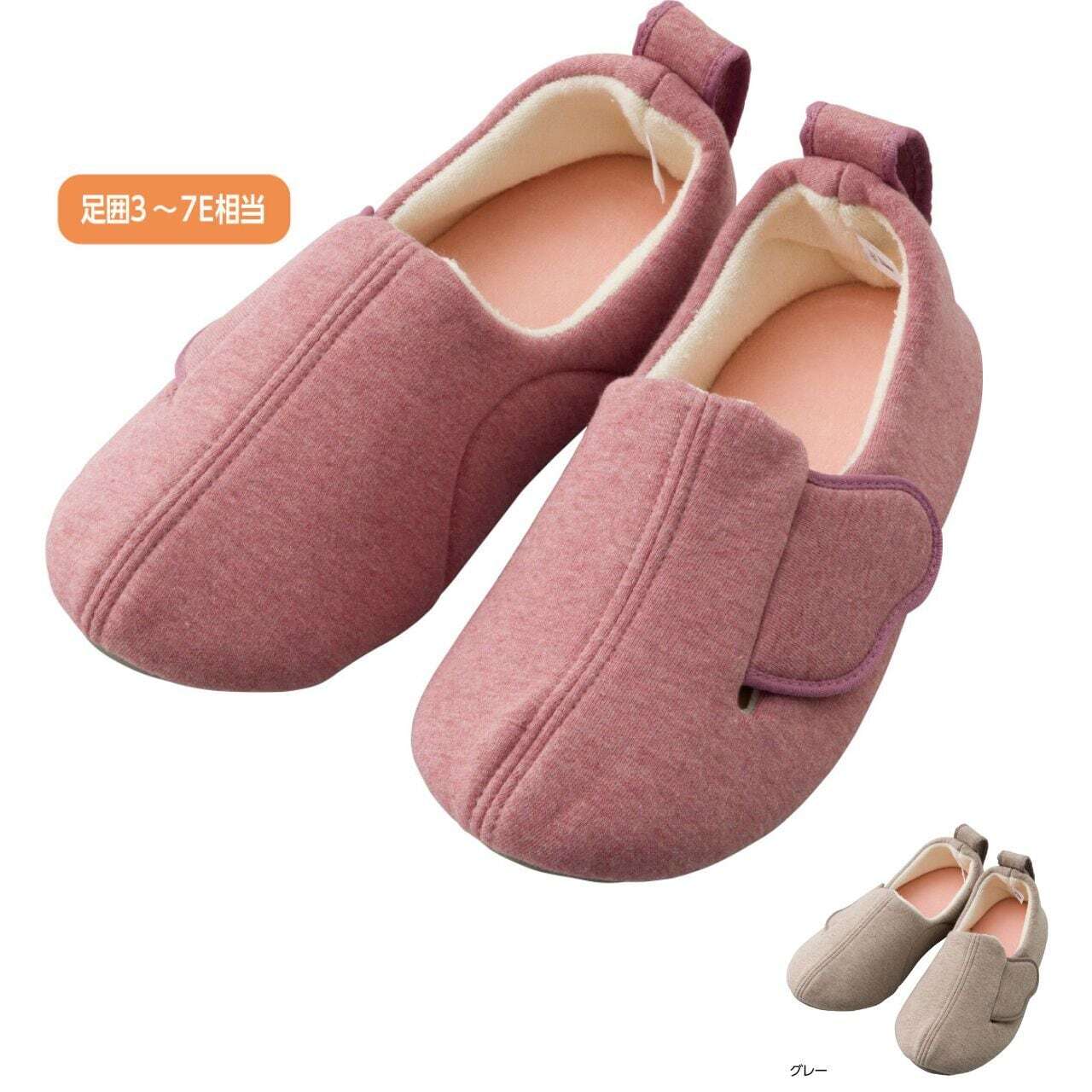 スリット入りで大きく開く履き口。ワンタッチテープで足囲サイズ調整ができます。