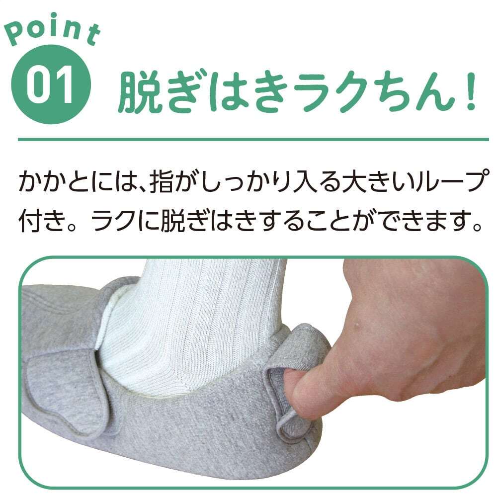 かかとには指がしっかり入る大きなループ付き。ラクに脱ぎはきすることができます。