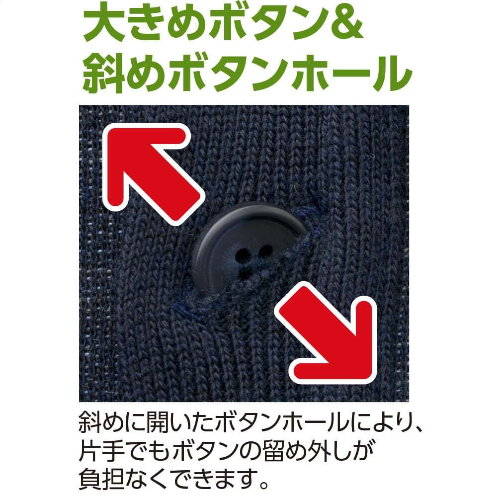 斜めに開いたボタンホールにより、片手でもボタンの留め外しが負担なくできます。
